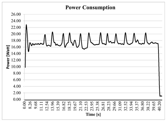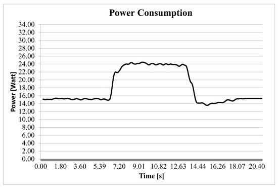 Figure 10 shows the power consumption during the experiment in Figure 8. The measured power consumption is quite constant at the maximum value during the time of the stationary configuration with the lifted payload. Changes of the power consumption are detected at the beginning of the lifting and at the return to the home configuration. However, power is needed to maintain the humanoid assembly in operation, even when it is not moving. The power consumption during the experiment, without taking into consideration the powering on phase, has a range between 13.32 and 24.09 W with a mean value of 18.07 W.