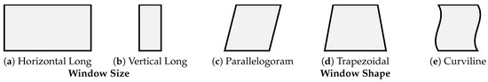 Examples of various kinds of window frames (horizontally long (a), vertically long (b), parallelogram (c), trapezoidal (d), and curvilinear (e). Horizontally-long and vertically-long being related to window size, and parallelogram, trapezoidal, and curvilinear belonging to the window shape.