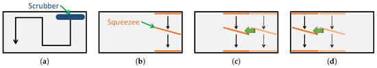 Cleaning ability, the second factor to be considered for the design of the proposed system refers to the identification of the best method to achieve effective cleaning. To identify the efficient cleaning mechanism for the robot, we observed the way of glass façade cleaning done by experts. For manual cleaning, the scrubber and squeegee are the primary tools used by experts. The experts clean glass walls by approaching the glass surface to be cleaned, washing the dirt off by using the scrubber and cleaning liquid, and finally wipe the dust residue using a squeegee (see Figure 2). We identified that to ensure an effective cleaning, experts clean the window from top to bottom and ensure the movement of the squeegee such that it traces the surface covered by the scrubber. Besides, they ensure the complete contact of the squeegee over the glass surface during cleaning and cleaning is done towards a single direction (see Figure 2 (b)→(c)→(d)).