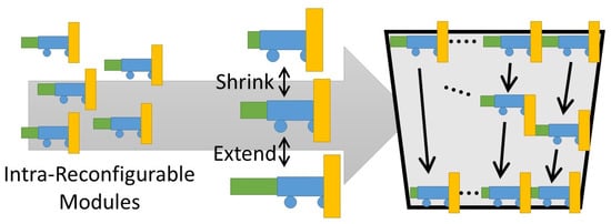 Nested reconfiguration for the glass façade cleaning robot. Extension and contraction of individual modules helps adapting to window shapes with different shapes (intra-reconfigurability). The robot system adapts to various window shapes by varying the number of intra-reconfigurable modules deployed (inter-reconfigurability). The arrows in the right figure and the dotted lines represent the movement flow and linkages of the modules, respectively.