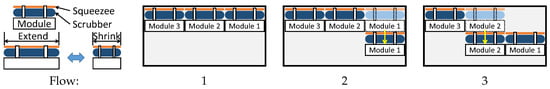 The strategy we adopt to realize both terrain adaptability and cleaning ability is the usage of multi-layer reconfigurability. Figure 3 shows a solution for window size and window shape adaptation that belongs to the factor “terrain adaptability”. Using a fixed number of robot modules, the extension and contraction of individual modules helps the robot system to adapt to various window shapes. For instance, if the window shape is trapezoidal, the extension and contraction of individual modules helps the system to traverse from the broader end to narrower end. On the other hand, a different trapezoidal glass window with a larger size can be cleaned by increasing the number of modules of the same kind and vice versa. The solution we identified is a modular system that consists of both intra- and inter-reconfigurability in hardware. The robot design is individually extendible (intra-reconfigurable) and is capable of conjugating with other modules (inter-reconfigurable). The intra-reconfiguration of each module helps the robot to adapt to various window shapes. Similarly, the system becomes adaptable to window size by varying the number of robot modules to be deployed. Figure 4 shows the identified cleaning mechanism and cleaning strategy for achieving cleaning ability. The cleaning ability can be accomplished by inter-reconfiguration of multiple modules. For instance, a two-robot system equipped with a squeegee next to the scrubber can execute the cleaning of the window from top to bottom. The scrubber can trace the movement of the squeegee and it can clean toward the one direction as well. The challenges of the hardware and software parts of the proposed robot system are listed below:
