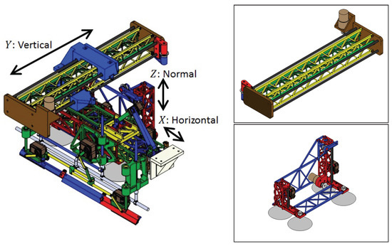 - Kawasaki, S.; Kikuchi, K. Development of a small legged wall climbing robot with passive suction cups. In Proceedings of the 3rd International conference on design engineering and science–ICDES, Pilsen, Czech Republic, 31 August–3 September 2014; pp. 112–116. [Google Scholar]