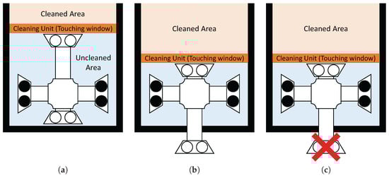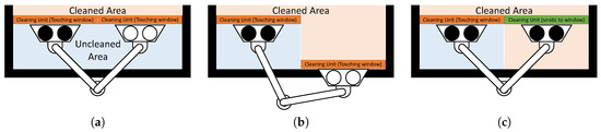 The three actuators perform three different tasks. The actuator on the horizontal directions helps to achieve the extension action, whereas the actuator in the normal direction helps to avoid the obstacles (the window frames that projects out from the glass surface) and traverse through the wall. The actuator in the vertical direction does the attachment of a nearby module. There are two common methods for achieving wall climbing. One is the legged type method as in the sky cleaners mentioned in [12,13], the robot proposed by Yano et al. [29,30], and by Kawasaki et al. [31]. Another method for wall climbing is the wheel/crawler-type, as in the works presented by Gao et al. [32,33], Miyake et al. [34,35], and Kim et al. [36,37]. The robots that belong to the legged-type family have discontinuous contact points on the glass surface and are controllable within the range of operation of the robot. However, a leg of the robot (a part of the negative pressure generating area) has to leave the surface of contact to achieve movement. Hence, the suction mechanism of the robot has to generate a large scale negative pressure during every locomotion. On the other hand, wheeled or crawler-type robots have continuous contact points on the glass surface. Unlike the legged type robots, wheeled type robots could generate adhesion force uniformly on the surface of contact during movement. In a glass cleaning scenario, it is necessary to overcome obstacles such as the window frames and protrusions on the glass surfaces to perform an efficient transition from one glass panel to the other. Comparing with wheeled robots, a pragmatically better robot design to achieve obstacle avoidance is the legged variant. Furthermore, wheeled/crawler-type robot design can be further subdivided into an X–Y stage design and a biped-type. As we discussed in the design challenges mentioned in the second section, the module has to move the cleaning unit from the top of the window to the bottom continuously to achieve effective cleaning. In the case of an X–Y stage legged robot, it is hard to realize complete area coverage due to its design limitations. Figure 6 explains the of locomotion of the X–Y stage legged type robots in the particular context in which the robot fails to accomplish complete area coverage. On the other hand, the same motion can be achieved in a biped design with the help of an enhanced control strategy (Figure 7). Hence, we choose the characteristics of the biped-type robot for the proposed design. We developed the robot module such that all modules are equipped with a biped mechanism and the ith module always conjugates with the module. Another characteristic of the proposed design is the individual controllability of the scrubber and squeegee in the cleaning unit because both scrubber and squeegee are required to move from the top of the window frame to the bottom.