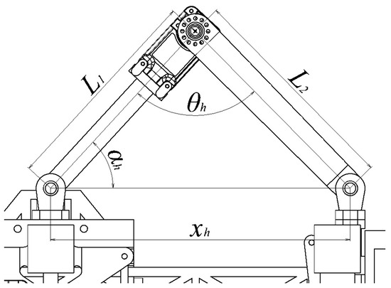 For the linear actuator in the horizontal direction, we used the slider-crank mechanism. The servo motor (HerkuleX DRS-0101, 12 kgf·cm of stall torque, 0.166 s/60 deg of maximum speed) is used as the driving force generator for the linear actuators. Let the angle of rotation of the motor and the length of each link be [rad], , and (as shown in Figure 9). From the law of cosines, the length of extension is calculated as: