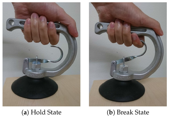 Handling of the suction cup. (a) Vacuum holding state; (b) vacuum breaking state. The suction is released by pulling the pin.