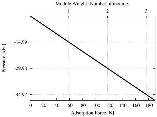 where, C [cm], P [−kPa], and f represent the area, vacuum pressure, and safety factor of the suction cup, respectively. Since four suction cups with 10 cm diameter each are equipped in the module, × × cm and the safety factor is set as 1/8 based on the standard value used for vertical lifting cases. Figure 11 shows the linear variation between the required vacuum pressure to the adsorption force.