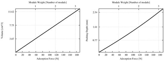 Figure 12 shows the required volume variation and the required variation in pushing depth corresponding to the adsorption force. From Figure 12 (Left) and (2), the required volume variation to hold one, two, or three modules is 3.87, 7.75, and 11.62 cm, respectively. From Figure 12 (Right) and (3), the required pushing depth to hold one, two, or three modules is 0.77, 1.61, and 2.54 mm, respectively.