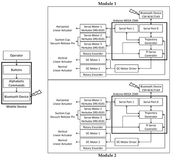 In this section, we discuss the underlying system architecture for controlling the proposed nested reconfigurable façade cleaning robot system consisting of two modules. Figure 13 shows the diagram of the implemented system architecture. Both of the modules are equipped with a Arduino MEGA 2560 microcontroller to control the actuators and running the foremost control program. The communication between the robot system and the operator is established in a wireless fashion using Bluetooth. We interfaced a DF-Robot Bluetooth V3 module (Bluetooth chip: CSR BC417143, Bluetooth protocol: Bluetooth Specification v2.0 + EDR) with the microcontroller to establish communication between the main controller and the user end Bluetooth device. The Pololu Dual VNH5019 Motor Driver Shield for Arduino is used for driving the DC motors. Lithium ion batteries of 11.4 V and 7.4 V are used for supplying the working voltages for the microcontroller and DC motors, respectively. The DC motors and the servo motors are controlled by a proportional-integral (PI) servo controller by taking angle information sent from the microcontrollers as the input command. One of the features of the proposed system is that the servo motors associated with the system are not driven directly by commands sent from the operator. Instead, the microcontroller receives the action to be performed by the robot from the user end as simple commands and generates the direction profile for all servo motors and DC motors. The rotation profile for each motor is updated in a closed control loop, whenever the microcontroller receives a command from the user. The above mentioned control method allows the user to control the robot without concerning any disturbances created by gravity and other external factors that affect the proper control of the robot system. The update of the trajectory and the rotation profile for the motors are generated by the microcontroller based on the type of command received from the user and number of times the command is received. Hence, the operator can operate the system instinctively by pressing and holding the button in a graphical user interface application in a smartphone or a tablet that has the Bluetooth connectivity. Besides, the trajectory update is limited to the working volume of the mechanical design and calculations from sensor values of the servo motors and rotary encoders of the DC motor.
