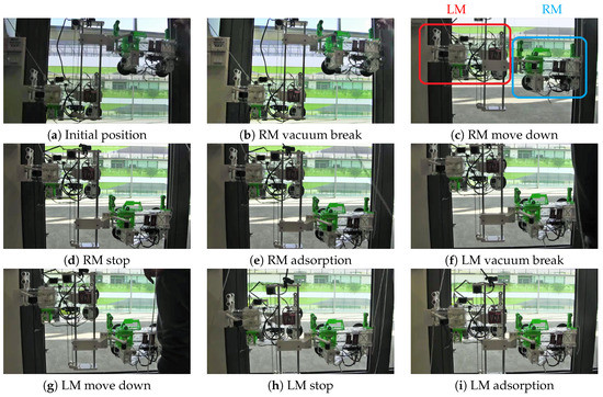 The snapshots of the experiment. RM and LM represent Right module and Left module, respectively. The experiment start form initial position (a). First, the vacuum of RM is broken (b), and is moved down (c) to bottom (d). After that, RM engages adsorption on the glass surface (e). Secondly, the vacuum of LM is broken (f), and is moved down (g) to neighbor of RM (h). Finally, LM engages adsorption on the glass surface (i) and the experiment is finalize.