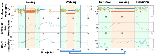 Figure 1. Snapshot of the data streams collected with two activities (orange boxes) and transitions (green boxes) highlighted. - Introducing a methodology for quantifying the accuracy of predictive algorithms for heart rate and respiratory rate under varying physiological activities and using different predictors;