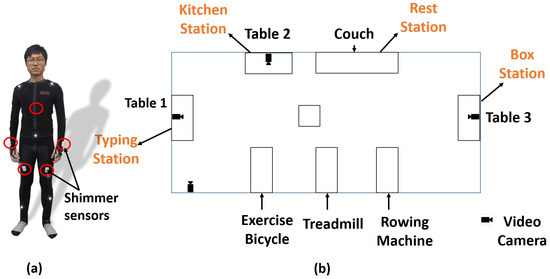 Data collection setup. (a) Individual with wearable sensors and (b) physical layout.