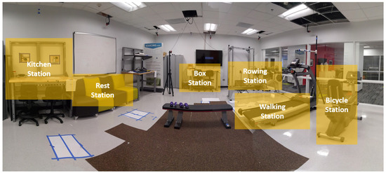 The data collection was undertaken at North Carolina State University (NCSU) under Institutional Review Board (IRB) 7799. All participants in the study were healthy individuals in the age group ranging from 18–30 years old. We collected data from 10 volunteers. The layout of the space where all the activities were performed is shown in Figure 2 and a panoramic view of the space in Figure 3. We focus on activities of daily life (ADL), including periodic (e.g., walking, bicycling), non-periodic (e.g., setting up a dinner table) and stochastic (e.g., typing a document). The participants had to undergo a 2-h session for training, placing sensors and data collection (approximately 1 h). The following tasks were included in the protocol: