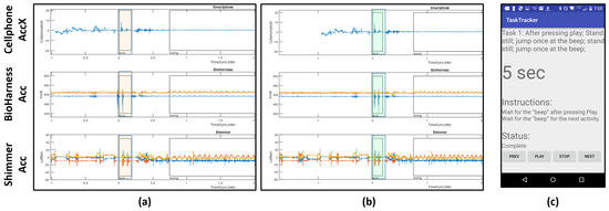 Figure 4. Data alignment and snapshot of protocol, (a) after preprocessing (the highlighted orange regions shows a minor misalignment between the peaks caused due to jumps on each device), (b) after post-processing (the highlighted green regions showing the corrected alignment via a manual process) and (c) snapshot of the protocol from the TaskTracker app.