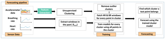 In the rest of this subsection, we discuss our pipeline to forecast physiological responses (see Figure 5). Features extracted from the accelerometer data are projected to a lower dimension via locally linear embedding (LLE); this is a dimension reduction technique (discussed in Section 2.4.1). Unsupervised clustering is then performed on these lower dimensional features to group similar activities together (discussed in Section 2.4.2). Windows in the past of physiological sensor data, namely breathing rate and heart rate, are extracted and used to create models for each cluster (discussed in Section 2.4.3). We propose an ensemble approach for forecasting of physiological responses by incorporating activity information from multiple scales (discussed in Section 2.4.4). For every test point, we repeat a similar procedure of extracting features and windows to find which cluster it belongs to and further use the model trained for that particular cluster to forecast these physiological quantities. We use standard evaluation metrics (discussed in Section 2.4.5) for analysis of the models. Different components of the pipeline are described in the following sub-sections.