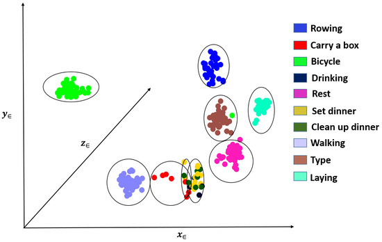 Unsupervised clustering was performed on the reduced acceleration features using the revised DBSCAN (density-based spatial clustering of applications with noise) method [41], which is more robust to the issue of border objects than the original DBSCAN [42]. The clustering radius is used in a hierarchical fashion. We start with a small radius and increase it gradually until we reach an at which all points belong to the same cluster. The range chosen during these experiments was 0.0002–0.06. Figure 6 shows an example of one such clustering for a fixed value. We colored points using the manual activity labels for visualization purposes only. We can see that similar activities are clustered close together, and dissimilar ones are far away from each other.