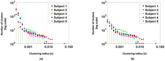 The clustering radius governs the number of clusters in a level of the hierarchy. Small values of (radius parameter) have a larger number of clusters, but as the increases, some of these clusters start merging with others to create more compact clusters. Figure 7a, shows number of clusters (log scale) versus the clustering radius for the 5 subjects in the study. We see that as the value increases the number of clusters drops.