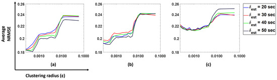Illustration of the effect of the parameter on the NRMSE for the model predicting breathing rate (BR) from heart rate (HR) for a (a) 10-s, (b) 30-s and (c) 60-s forecast.