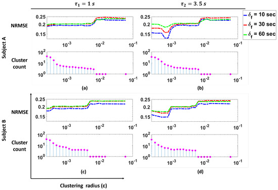 We perform a hierarchical analysis on the clustering parameter to understand the effect of changes in the clustering as the parameter increases. Figure 9 shows the NRMSE for the prediction of BR from HR using our cluster SVM strategy as a function of the clustering radius for two subjects in the study, as well as the number of clusters as a function of . These clusters correspond to the clusters remaining after outlier removal. In the figure, the plots for s are shown.