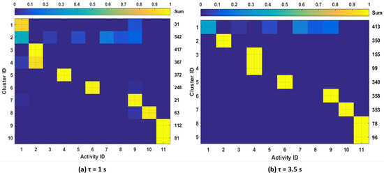 For our application, choosing an optimal window size translates to extracting features that properly discriminate between activities at the right temporal scale. It is desirable to have similar activity clusters close to each other, while dissimilar activities farther away. In order to select the values of and , we performed an analysis similar to the one presented in our prior work [40]. In this work, a classifier is used to determine the pair that yields the best F1 score for activity recognition. This classifier combines activity label predictions from features using either or window sizes via a maximum likelihood approach. These values for are also consistent with the range between 0.25 and 12.8 s, which has been previously reported in the literature for best classification [31,32,33]. Therefore, we use values obtained from this analysis: s and s.