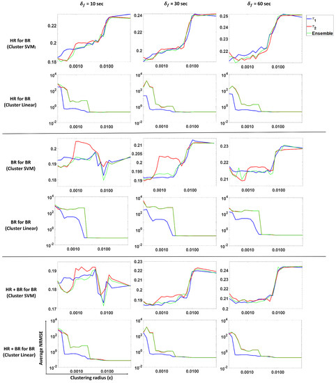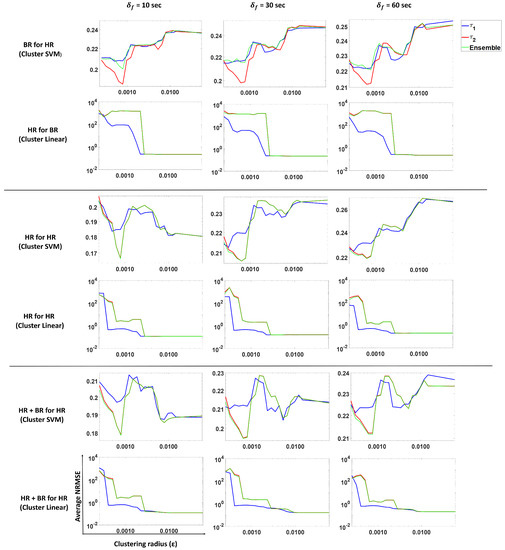 These results show (Figure 11, Rows 1 and 2) that using heart rate can be useful to forecast breathing rate when the latter is not measured. In the SVM case (Row 1), smaller values (more clusters) result in a lower NRMSE as compared to larger value (fewer clusters). For , we observe that the average NRMSE values increase dramatically as the number of clusters decreases (i.e., increases). However, the linear model (Row 2) does not show the same pattern, indicating that clustering does not help this model to predict BR from HR only.