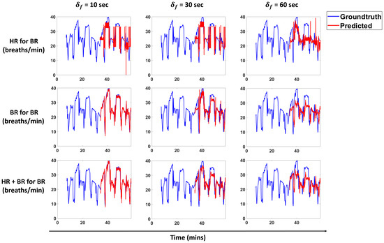These multi-modal data streams have different sampling rates, i.e., the numbers of data points per stream are different. We interpolated the heart rate and breathing rate to 1 Hz. Interpolation is necessary in order to have data points for all time values used to make predictions. Raw breathing rate and heart rate were extracted over windows in the past () of size 20, 30, 40 and 50 s and used as predictors to assess the impact of the different sizes of windows on the forecasting results.