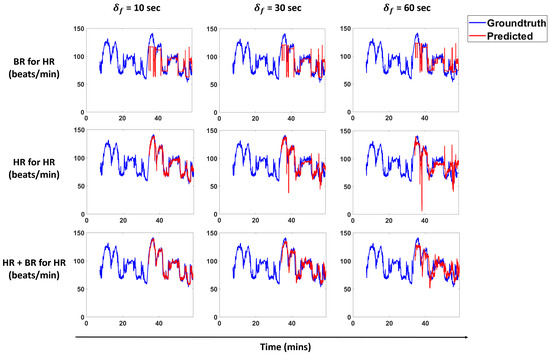 The proposed pipeline was tested on 5 subjects. Half of the data were used for training and the other half for testing for each individual. This is done in order to mimic a scenario in which historical data of an individual are used to train a personalized model for predictions into the future. As discussed in Section 2.4.1, we use the window sizes and for activity clustering. Physiological parameters do not change as quickly as the activities, so we need to pick larger windows to capture the variation from the data streams corresponding to physiological parameters. We show our analysis for forecast periods 10, 30 and 60 s, for which we picked historical windows with and 50 s in the past. We go only up to a 60-s forecast since in the dataset, we had activities that spanned for only a couple of seconds.