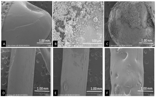 SEM pellets and filaments. (A) Control pellet; (B) gentamicin sulfate (GS) powder; (C) 1 wt % GS-polylactic acid (PLA) pellet; (D) Control filament; (E) 1 wt % GS-PLA filament; and, (F) 5 wt % GS-PLA filament.