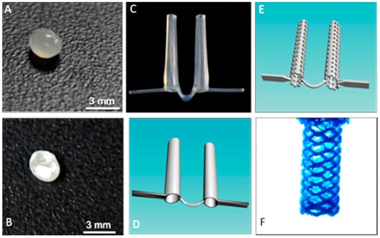 We used a novel powder bead formulation method in developing the custom polymers used with a new grade of biomedical extruder (see Figure 1) [14,16]. Customized powder-coated pellets are extruded to form the required filaments. The design process begins with 3D scanned images of the oral cleft/defect that is used as a guide to fabricate a hard and compliant, but inert material, replacing the soft medical grade silicone impression, thus eliminating the airway risk during silicone impression taking (Figure 3 and Figure 4). 3D scanned images of currently used stents (Figure 3C,D) can be taken and used to design the customized stent to be fabricated via 3D printing as either solid, porous, or mesh forms, and with different thermoplastics or polymer composites (Figure 3E,F). Further customization can be done using the 3D scanned CAD file and 3D scanned images of the oral cleft/defect (Figure 4A,B). The 3D nasal mold image can be rendered with the 3D scanned stent and the stent shaped into compliance using the CAD software (Figure 4C,D). Finally, using the final drawn stent as a guide, a 3D printed hard and compliant but inert material can be fabricated to replace the soft medical grade silicone impression currently used (Figure 4E,F).