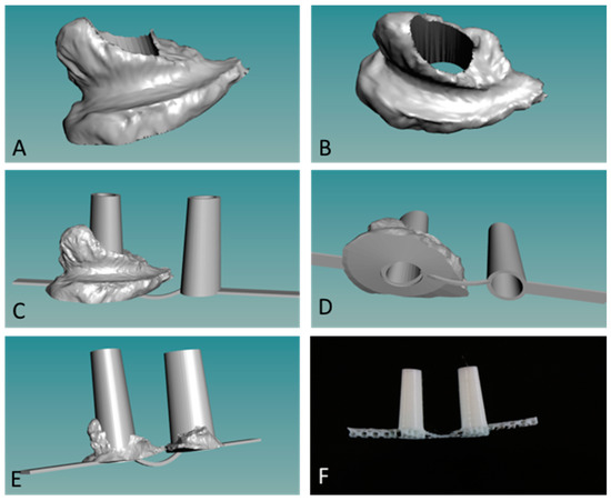 Customization of nasal stents. (A,B) Images of 3D scanned nasal molds from subject X; (C,D) Scanned nasal mold is used as guide to render a CAD designed and compliant nasal stent; (E) 3D CAD image of customized stent; (F) three-dimensional (3D) printed and patient-specific stent. Smoothing before implantation is the final step.