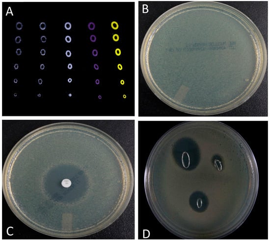 Growth inhibition studies. (A) Image of different types of cross-sectioned nasal stents; (B) Confluent plate of cultured E. coli; (C). GS control disk showed a pronounced zone of inhibition; and, (D) Cross-sectioned GS doped nasal stents (varying in overall diameter) also showed pronounced zones of bacterial growth inhibition.