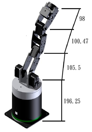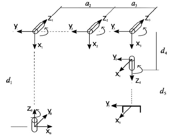 The forward and inverse kinematics of the robotic arm were physically modeled and numerically solved by Denavit-Hartenberg (D-H) matrix [20] based on the Equations (1) and (2). The robot coordinate frames for transformation are shown in Figure 4, and the corresponding D-H parameter of the robotic arm can be obtained in accordance with this model of coordinate frames.