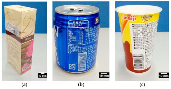 Three different test packages: (a) A paper-foil milk tea drink; (b) An aluminum soda can; (c) A plastic box of biscuits.