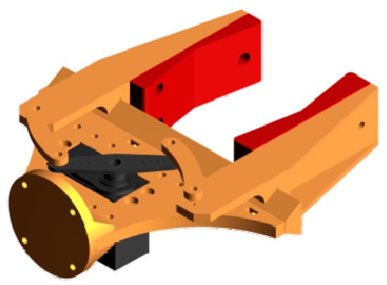 We designed a gripper for the robotic arm with a total length of 165 mm and a maximum moving distance of 97 mm, to cope with the different shapes and nature of the packages, see Figure 3. The actuator used for the sliding motion of the two gripper fingers was a TowerProMG996R servo motor unit produced by Tower Pro Ltd. (Taipei, Taiwan) (www.towerpro.com.tw), which can generate a maximum torque of ~1.08 Nm at an operating speed of 0.14 s/60° and a voltage of 6 V.