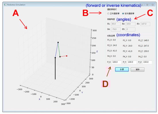 A graphical interface simulation of robotic motion with four features including: (A) Simulation chart; (B) Kinematic mode; (C) Angle of each axis; and (D) Coordinates of each axis.