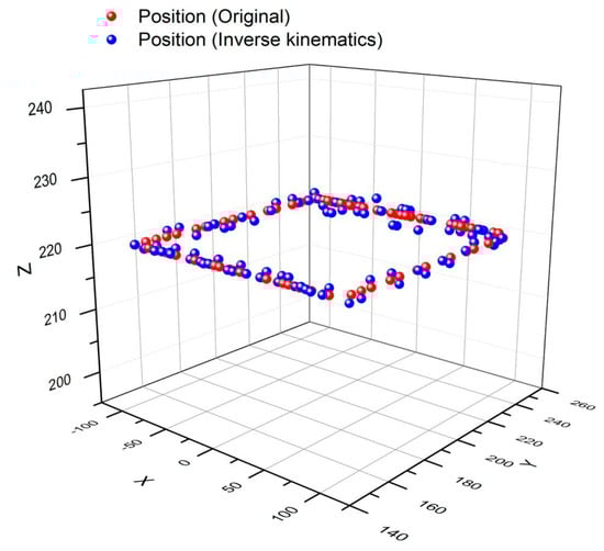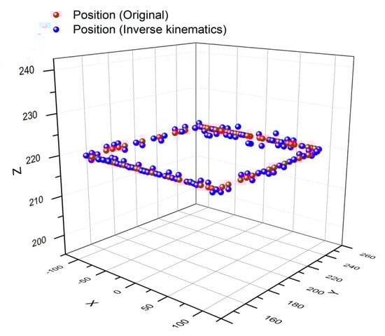 In Figure 6, the solid red line represents the planned path from the numerical calculation by the computer program, while the solid blue circular dots stand for the measured coordinates of the robot arm end actuator in actual motion. The average errors of the tri-axial coordinates were determined as X = 2.49%, Y = 0.14%, and Z = 0.28%.