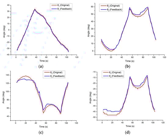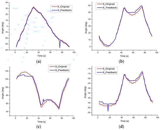 The theoretical and measured angular changes in each axis of the robot arm carrying an object and moving along a given rectangular path: (a) Axis-0 (θ1); (b) Axis-1 (θ2); (c) Axis-2 (θ3); (d) Axis-3 (θ4).