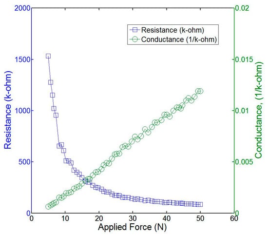 The electrical resistance and conductance of the sensor corresponding to an applied force.