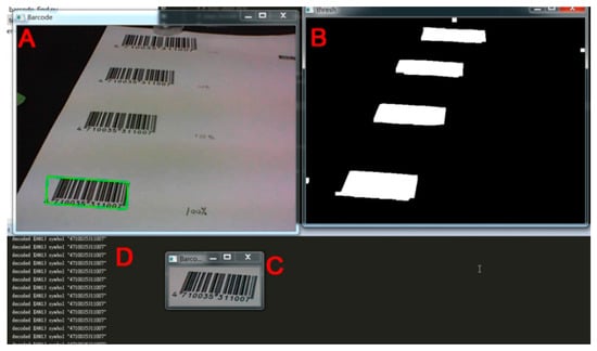A regular web camera was used for one-dimensional barcode identification. Some of the EAN barcodes used by most retailers everywhere are shown in Figure 11, illustrating the algorithm of bar code recognition [21,22]. First, A in the figure is the original image captured by the camera, and the identified barcode is outlined by a green rectangle via comparison to preset thresholding values for edge detection; Secondly, B is a transformed binary image in grayscale from original color one, in which the white area represents the position of the barcode; Thirdly, C is the identified barcode ready for dimension reading of binary black and white stripes based on the EAN code; Finally, D shows the content transformation of the barcode displayed in the command bar, successively showing the decoded 13 digital numbers. The experimental results showed that the minimum proportion of 50% of a barcode could be correctly captured and identified at a maximum distance of 19 cm, thereby reaching a success rate of approximately 100% under normal test circumstances.