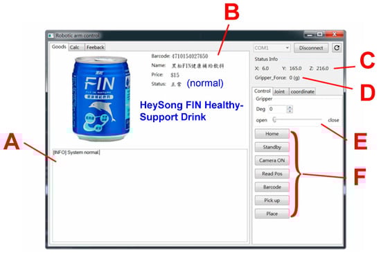 The graphics user interface (GUI) of the APP that enables the robot arm to perform computer vision bar code identification and goods inventory is shown in Figure 12. As mentioned earlier, the web camera captures the barcode image and uses the data to find the corresponding information about the object to determine if it was correctly placed. If the placement was wrong, the robot would pick up and remove the object. Please note, thus far, the position of object was pre-determined by the user because of no distance sensor was used here. This could be further implemented in the future. Finally, the overall GUI system was integrated into an embedded computer (Raspberry Pi) with a 10-inch touch screen as shown in Figure 13. Intuitive control of the robotic arm could be achieved by simply touching the command buttons.