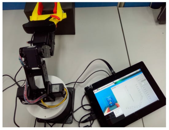 The aim of this study was the development of a robotic arm with computer vision identification, as well as a mobile application (APP) for the barcode identification of goods using a WiFi connection [11,12]. The devised system could be installed on a vehicle that moves around the store to scan the bar codes of goods on the shelves. It can notify staff of the need for goods replenishment and can move products that have been incorrectly placed [13,14]. Traditional vision identification applications usually involve the use of a PC and a considerable amount of power and complicated software. However, the small computers now available are powerful, use very little power and the software needed is simple and versatile. The use of these little devices is economical and they can easily be used for such applications as goods inventory [15,16].