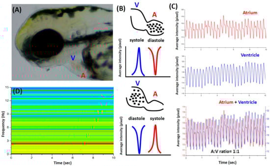Our cardiac rhythm measurement method was based on the dynamic pixel changes in the heart region (Figure 2A). Most images had a valid intensity range of pixels from 0 (black) to 255 (white). The higher the brightness of an image, the higher the pixel intensity number [17]. The highest peak represented the greatest abundance of red blood cells that were pumped out of the heart chamber, defined as contraction (systolic phase). On the other hand, the lowest peak represented the greatest abundance of red blood cells that filled the heart chamber, defined as relaxation (diastolic phase) (Figure 2B,C). Generally, a normal human heart rate is around 60–90 beats-per-minute (bpm) in the resting state. The heart rate of 72 hpf zebrafish is around 120–180 bpm. Therefore, zebrafish is an ideal animal model for heart rate compared to mice with high heart rates at 300–600 bpm [8]. We observed that the heart rate of wild-type fish was at 137 ± 8 bpm (n = 10). Based on either the atrium or the ventricle as ROI calculation, we tracked the cardiac rhythm and found there were no significant differences between the atrium and the ventricle (Figure 2C). The distance between two consecutive highest points of the peaks was calculated as time interval of contraction. The time interval of atrium and ventricle contraction was consistently at 0.4 ± 0.03 s in control embryos at 72 hpf. Short-Time Fourier Transformation (STFT) was used to transform time interval into frequency domain (Figure 2D). The heartbeat frequency in control fish was around 2.3 Hz (Figure 2D), which is consistent with previous study [18,19]. Basic frequency (red color) in wild-type control was consistent during the examination period [10].