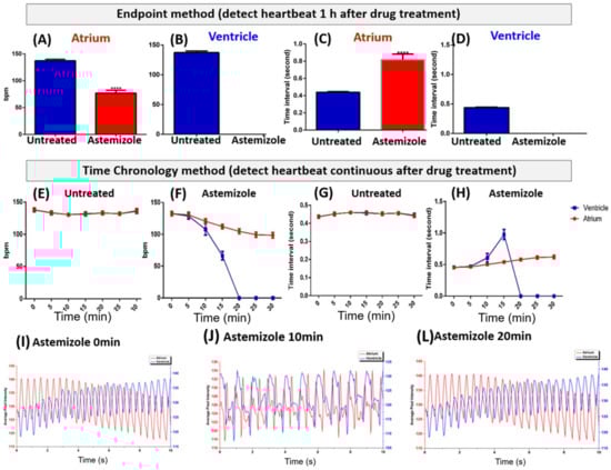 Endpoint and time chronological evaluation of astemizole on heartbeat in embryonic zebrafish 72 hpf. Atrium (A,B) and ventricle beat-per-minute (bpm) were compared between untreated control and 5 µM astemizole-treated embryos after one hour of incubation. Atrium (C) and ventricle (D) beating time interval of untreated control and 5 µM astemizole-treated embryos after one hour of incubation. Beat-per-minute (E) and time interval (G) in untreated control embryos in a chronological method. Beat-per-minute (F) and time interval (H) in 5 µM astemizole-treated embyros in a chronological method; (I–K) is the dynamic pixel change patterns of the atrium and the ventricle after 0, 10 and 20 min astemizole treatment at 5 µM concentration. The data are expressed as the means ± SEM and were analyzed by t-test (**** p < 0.0001, n = 10).
