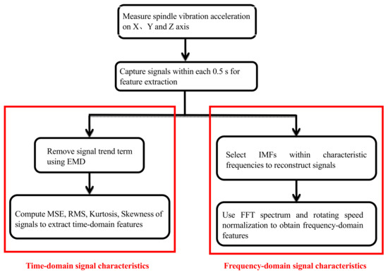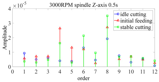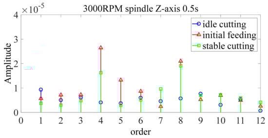 The flowchart of the signal processing and analysis in this experiment is shown in Figure 3. The vibration accelerations of the spindle along the directions of the three axes were measured, and then the features in the time and frequency domains were extracted every 0.5 s. In the time domain analysis, EMD was first utilized to separate the vibration measurements and reconstruct the signals by adding the IMFs of certain frequency bands. MSE, root-mean-square (RMS), kurtosis, and skewness values of the reconstructed signals were calculated as the time domain features. On the other hand, fast fourier transform (FFT) was employed to determine the spectral features of the reconstructed signals in the frequency domain. The spindle rotation speeds in this experiment were set to 900, 1000, 1800, 1900, 2000, 2100, 2700, and 3000 rpm. The feed rates were set to 228, 240, 252, 320, 400, 420, 532, 560, and 588 mm/min. The cutting depths were 0.5–1.0, with increments of 0.1 mm. In order to extract the rotation speed-related features, the frequency domain features need to be normalized to obtain the features in the order domain [12]. As shown in Figure 4, For example, Figure 4 shows the FFT spectrum of vibration signal under rotating speed of 3000 rpm. The FFT spectrum is normalized by a rotation speed of 3000 rpm to obtain its corresponding order distribution, as shown in Figure 5. The frequency domain features also consist of the ones not related to rotation speed, which may be attributed to natural structural vibration or external noise, and hence they should be removed to enhance the accuracy of identification.