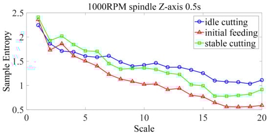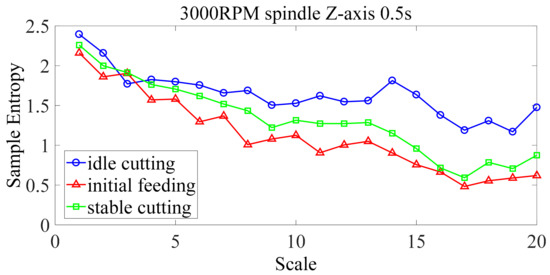 Figure 6 and Figure 7 show the MSE of the vibration acceleration at the Z axis under different rotation speeds. Regardless of the spindle rotation speed, the entropy values in idle cutting, initial feeding, and stable cutting were all significantly different in some scales. This indicated that the complexities of the vibration signals of the three statuses had obvious distinctions [13,14].