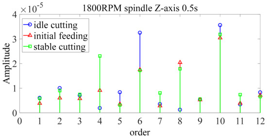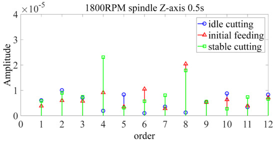 As stated in the previous section, the frequency domain features consisted of those related to the spindle speed (such as characteristic frequencies of rotating machinery) and those not related to spindle speed (such as the structural resonant frequencies). When observing the order spectrum, the features that are not related to the rotation speed may be found around the orders in which the rotation speed-related features are also located. These order features may interfere with each othre and cause misunderstanding. The order spectral distributions under 3000 rpm are shown in Figure 8 (entire vibration signal) and Figure 9 (with removal of the order features not related to the rotation speed). It was noted that the order distribution had obvious changes at the sixth and eighth orders after removing the features that were not related to rotation speed. Namely, the major orders affected by the rotation-speed-unrelated features were the 6× and 8× rotation speeds. Figure 10 (entire vibration signal) and Figure 11 (with removal of the order features not related to rotation speed) showed the order spectra under 1800 rpm. As observed in the figures, the apparent differences between the order distributions could be found at the sixth and tenth orders. This means that the major orders that were affected by the features were not related to rotation speed were the 6× and 10× orders. It was also observed in Figure 9 and Figure 11 that the energy at the 4× and 8× orders had an apparent distinction between the classes of idle cutting and initial feeding. The main reason was that the tool we used had four blades, and, hence, the cutting frequency on the surface of the work piece could be found at the 4× and 8× orders. Therefore, the features at these orders were capable of identifying the milling statuses of idle cutting and initial feeding.