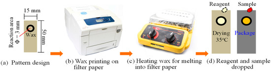 Figure 1a–d show the main steps, including (a) pattern design, (b) wax printing, (c) heating wax process and (d) reagent and sample dropped, in the fabrication process used to prepare the paper-based chip. The chip was fabricated on Advantech qualitative filter paper (No. 1, Toyo Roshi Kaisha Ltd., Tokyo, Japan; pore size: 6 µm; thickness: 0.2 mm) and consisted of a circular reaction zone with a diameter of 3 mm bounded by an impermeable wax ring with an outer diameter of 5 mm. The chip was designed using CorelDrawR Graphics Suite X5 software and printed using a commercial wax printer (Fuji Xerox ColorQube 8750, Japan). After printing, the chip was heated for 3 min at 120 °C in a benchtop furnace (Vulcan A-550, Taiwan) to melt the wax and form a hydrophobic barrier through the thickness of the paper. Finally, the paper-based chip was bonded with a cardboard substrate using 3 M double-side tape (V1205, 3 M Comp., Taipei, Taiwan).