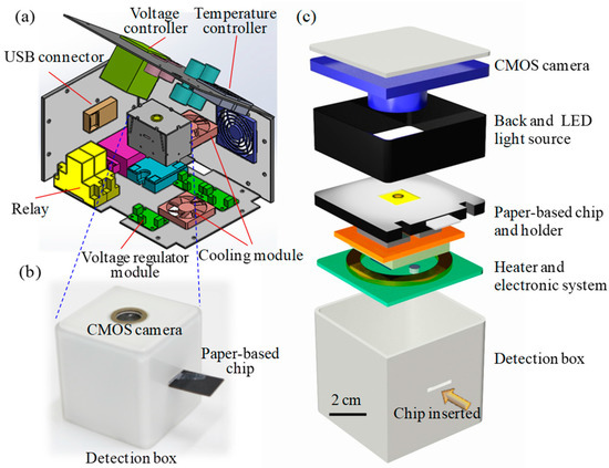 As shown in Figure 2, the main components of the detection system include a power source, a temperature controller, a voltage controller, a cooling module, a detection box and a smartphone (Xperia Z5, Sony Co., Tokyo, Japan) The detection box further contains a CMOS camera (1920 × 1080 pixels, Dmatek Co. Ltd., Taichung, Taiwan), two LED light sources, a microheater, a chip holder and a connector. A more detailed and the function of the module in the detection system can be referred to our previous study [46].