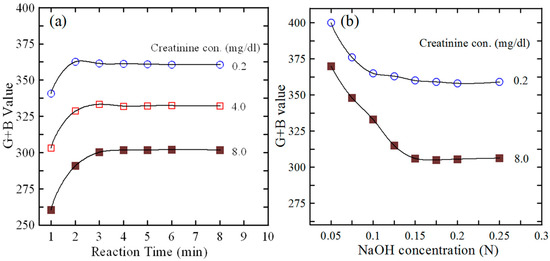 (a) Reaction time stability of samples with various creatinine concentrations given reaction temperature of 37 °C; (b) G + B values of creatinine samples with concentrations of 0.2 mg/dL and 8 mg/dL given different NaOH concentrations and constant reaction time of 5 min.