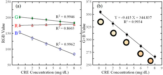 (a) RGB intensity values of creatinine samples and (b) variation of G (green) + B (blue) intensity (and associated color images) with creatinine concentration in the range of 0.2~8 mg/dL. (Note that the reaction temperature and reaction time are 37 °C and 5 min, respectively.).