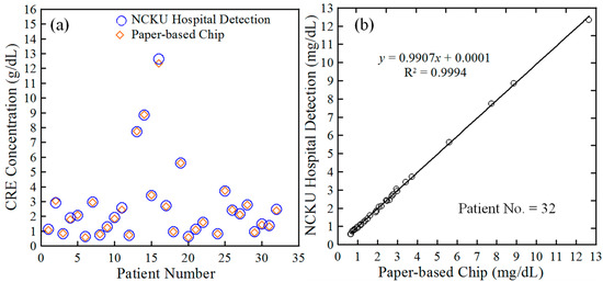 The applicability of the proposed platform for clinical diagnostic purposes was investigated using human serum creatinine samples obtained from 32 adult volunteers (patients at National Cheng Kung University Hospital in Taiwan). These human serum creatinine samples are obtained from whole blood samples via a separation and purification process at the hospital. The detection results were compared with those obtained using a macroscale human serum creatinine assay technique (a spectrophotometry method performed using an automatic biochemistry analyzer/integrated system 7600, Hitachi High-Technologies Co., Tokyo, Japan) at a major university hospital in Taiwan (National Cheng Kung University Hospital, Tainan, Taiwan). Figure 5a presents a scatter-plot of the results obtained for the 32 samples by the two methods. As shown in Figure 5b, the two sets of results are related as Y = 0.9907X + 0.0001, with a correlation coefficient of 0.9994. In other words, the ability of the proposed paper-based human serum creatinine system to detect the creatinine concentration in real-world samples is confirmed.